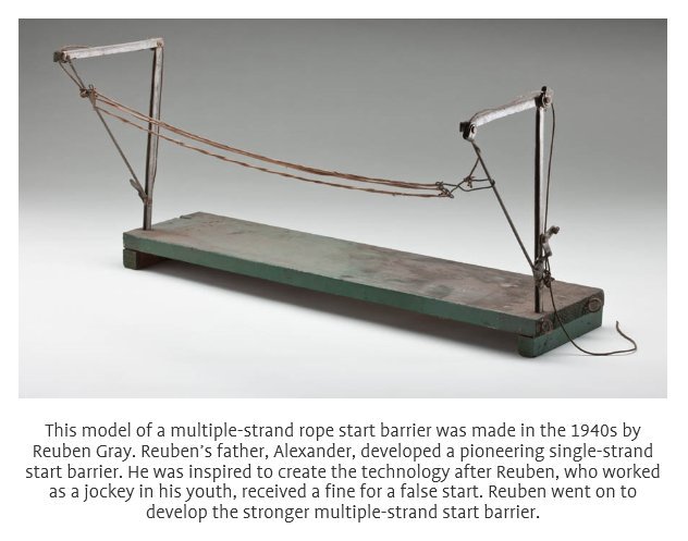 Alexander Gray had concluded that the flapping of a starter's flag distracted the horses. An impetus for his invention was a £5 fine received by his son, Reuben, a jockey, for allowing his mount to step over the white chalk line that marked the start. His machine was first tried out at Canterbury Park Racecourse in New South Wales in February 1894. The prototype consisted of a single strand of wire at about the height of the horse's head that was attached to a spring at either end. When the device was activated the barrier sprang up and away from the horses. By the 1920's the single strand barrier had evolved into a springpowered five-strand device designed by Johnson and Gleeson, but based on Gray's prototype, that resembled a strongman's chest expander.